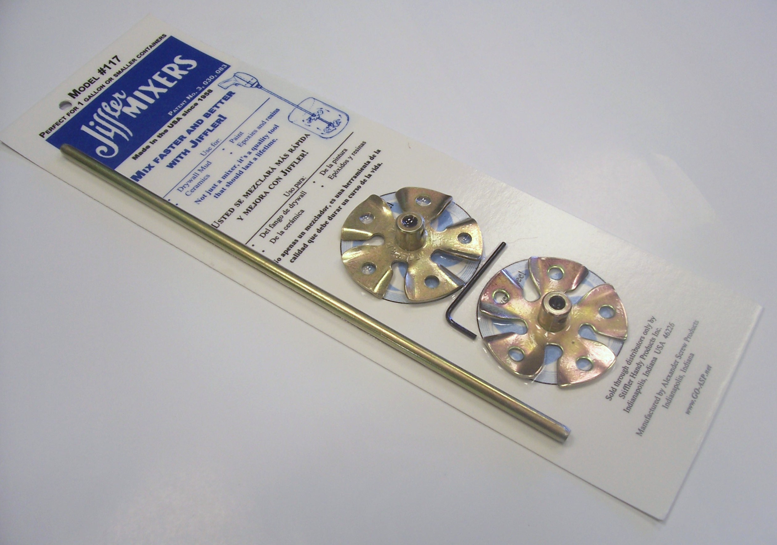 Made of plated steel, 2-1/2" wheels adjustable on 1/4" x 11" shaft. for portable or stationary power of 1800 plus r.p.m. in 1 gal. to 10 qt. container, depending on viscosity of mix.